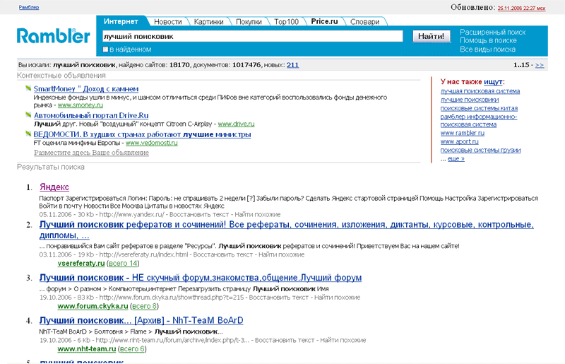 Результат снова удивил. В первых двух десятках ссылок — ни одного поисковика! Тут мне еще подбросили как идею Рамблер, и о чудо — первым в списке выскочил Яндекс.