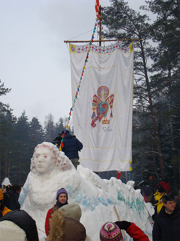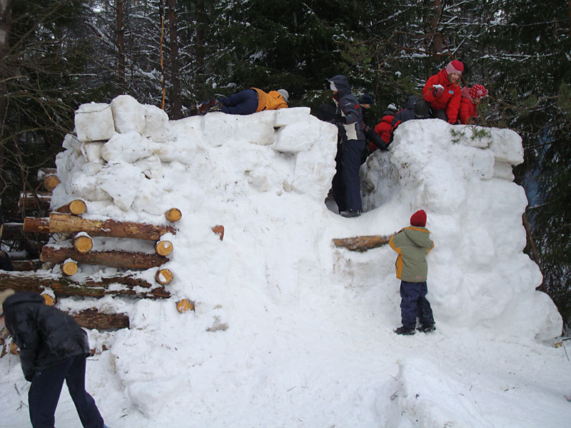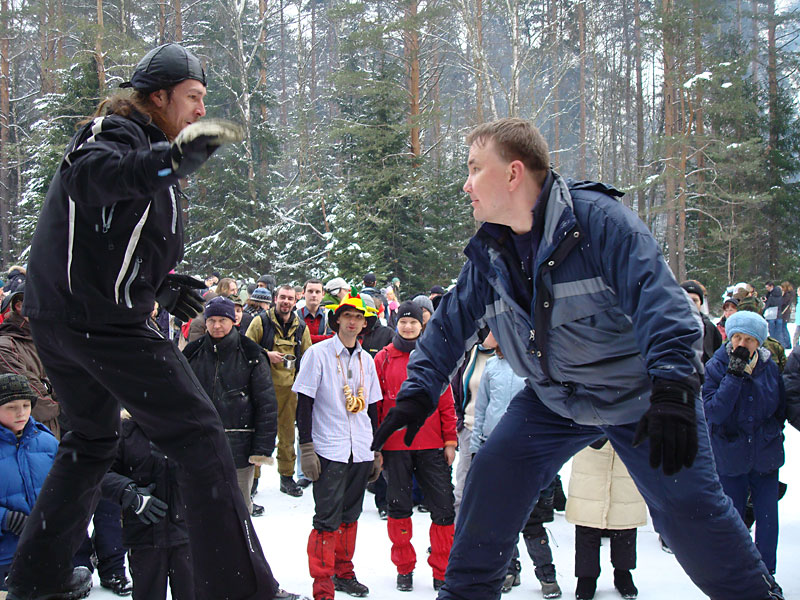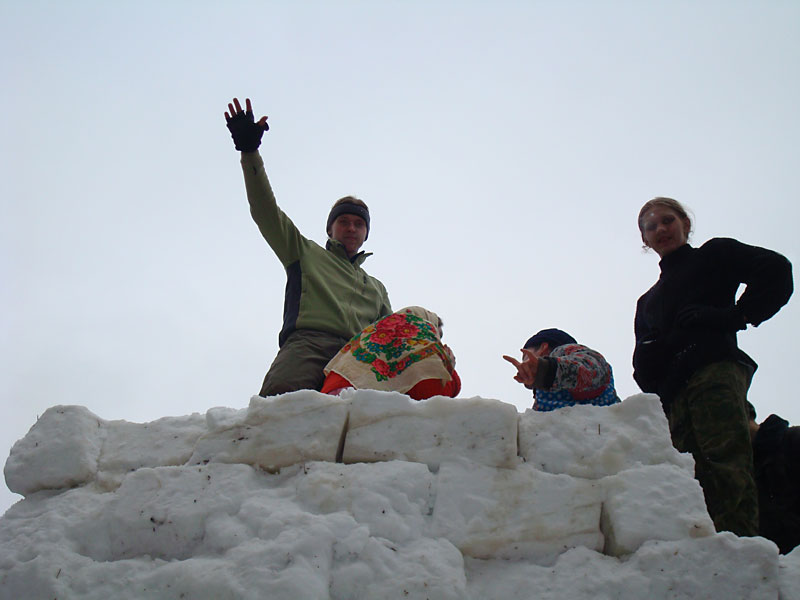 Развлечений кругом — пруд пруди: стенка на стенку, борьба, бои подушками с завязанными глазами, хороводы, блины. Из снега наваяли с десяток фигур — от ежиков до внушительного корабля.