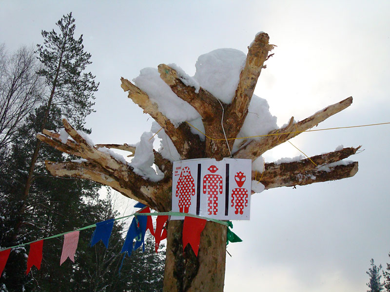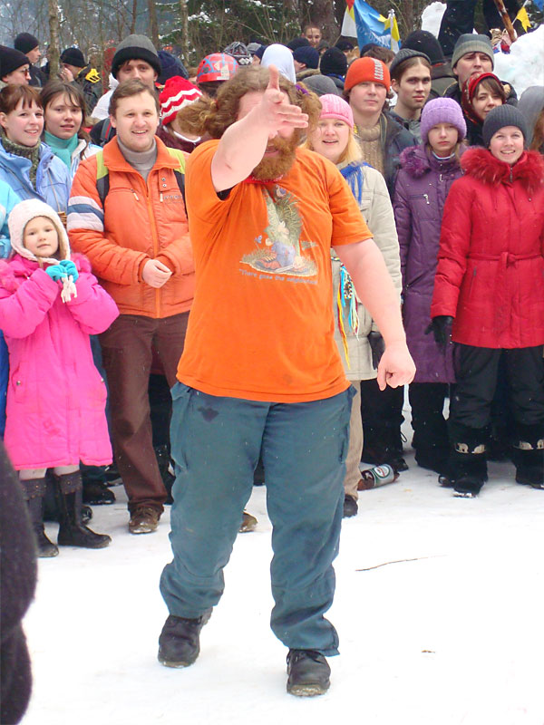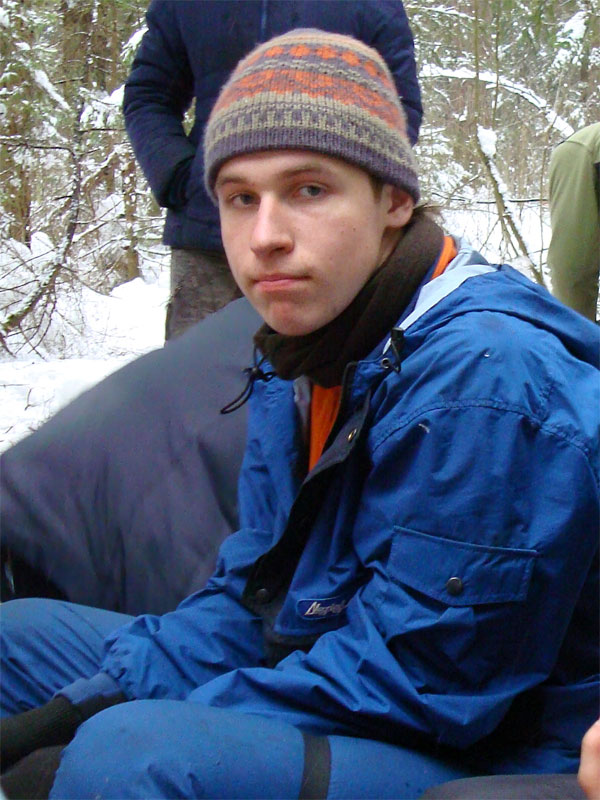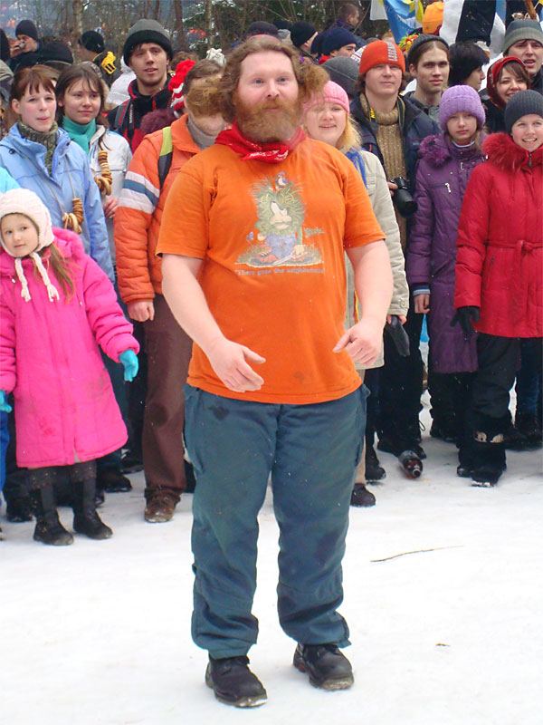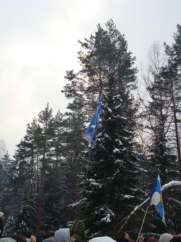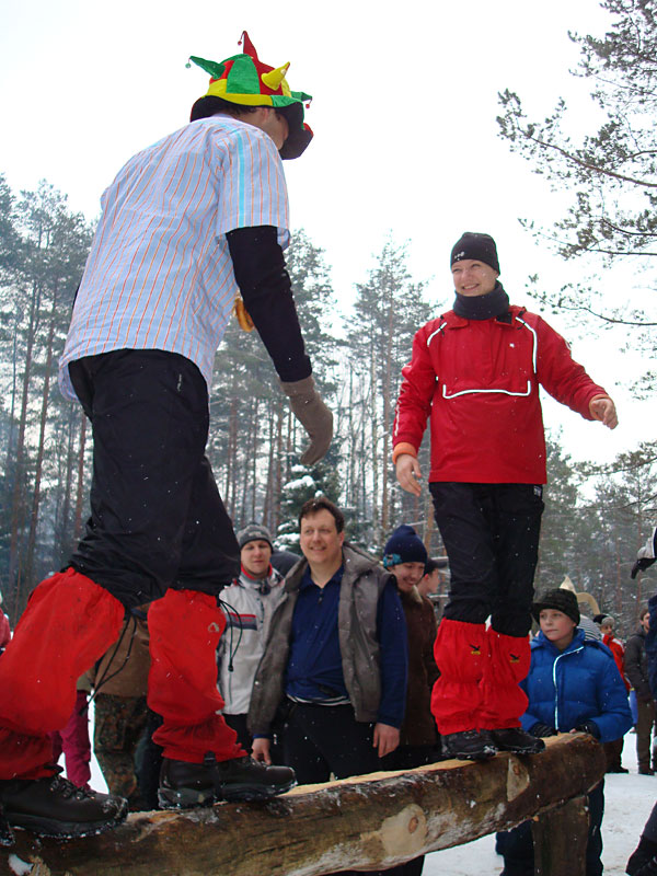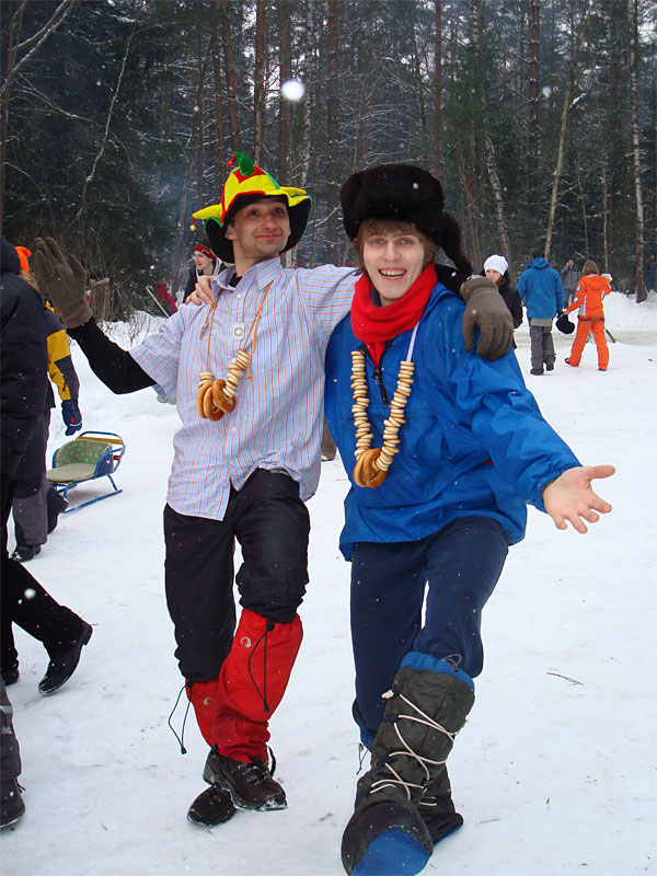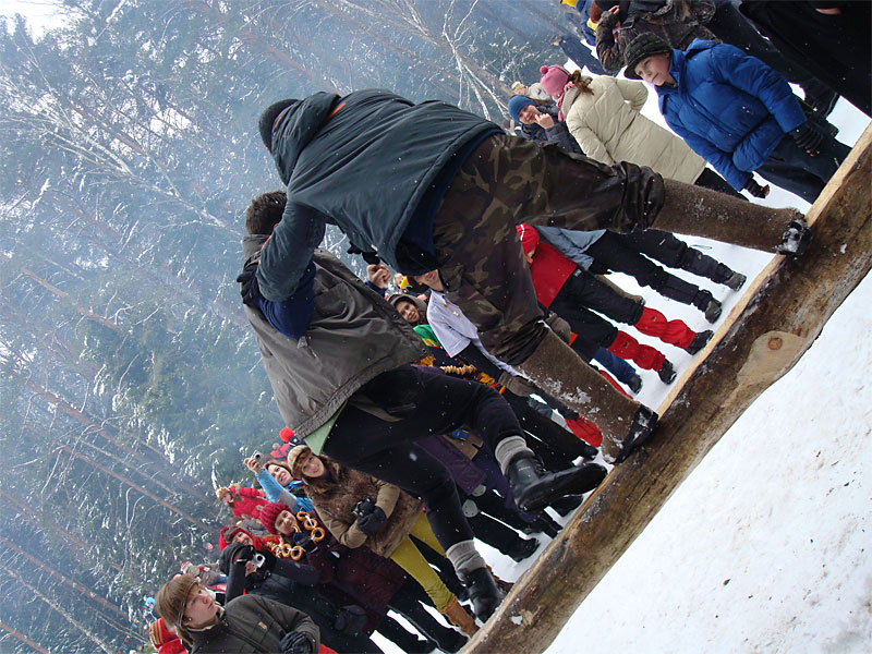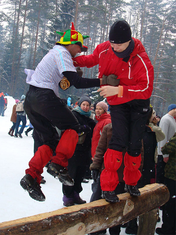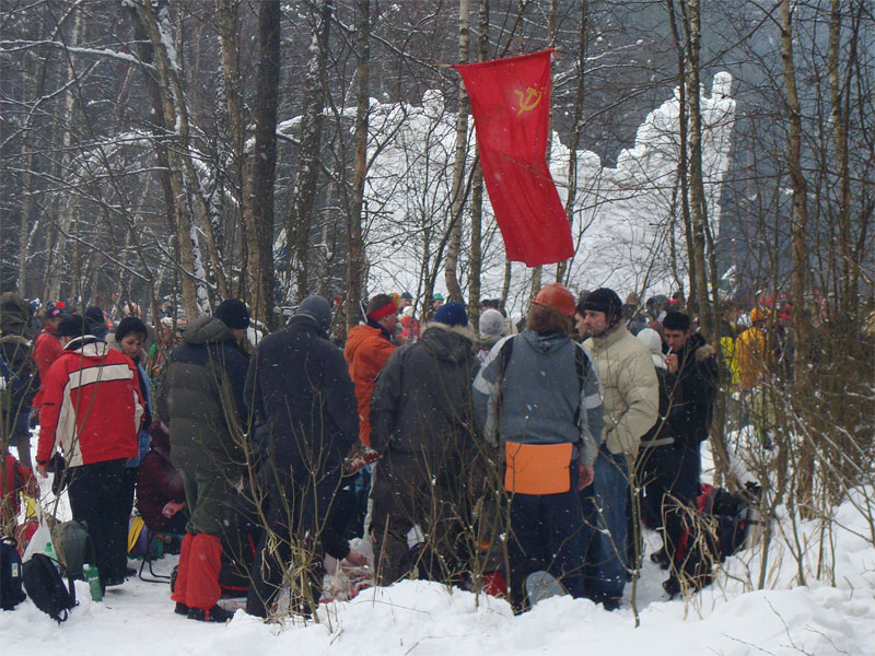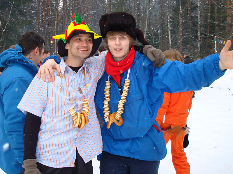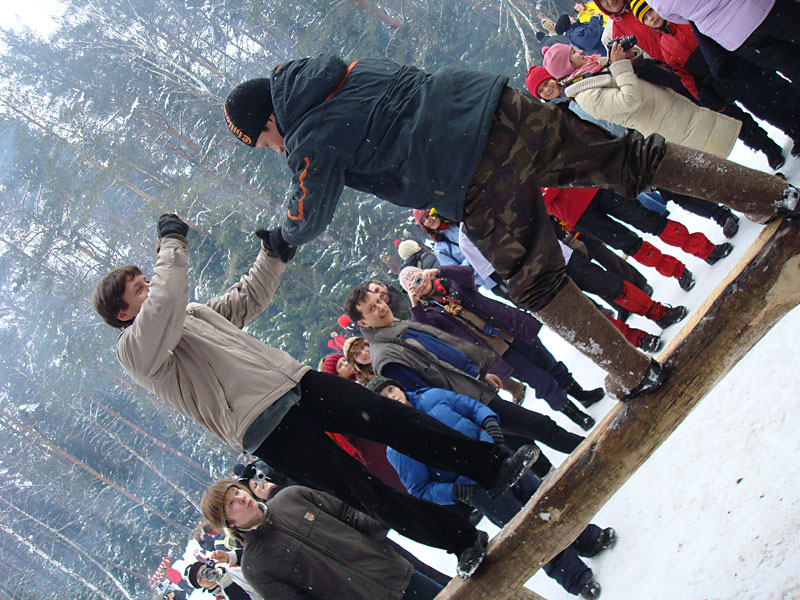 Я давно знал, что под Москвой каждый год устраивается большая встреча масленицы, но никогда до этого не участвовал в ней, а в этом году меня все-таки соблазнили ею. Без малого в семь вечера я оседлал электричку, в которой уже катились те, кто подбил меня ехать, и мы вместе благополучно добрались до пл. 49 км. Уже в электричке стало ясно, что что-то тут неладно: только в нашем вагоне сидело около 15 человек с рюкзаками, на платформу же высыпало чуть больше пятидесяти таких же, обгоняя которых, мы двинулись быстрым шагом к заветной поляне. Место основного действа появилось необычно: сначала издалека потянуло костром, потом будто кто-то вдруг включил звук — еще сто метров назад не было слышно ничего, как вдруг зашумела бензопила, застучали топоры и послышались крики. Иногда мне нравится приходить вот так затемно в лагерь, иногда — нет. В этот раз вечер превзошел ожидания. После непродолжительной установки палатки, доработки пентагона и пилки-рубки дров началось выпекание блинов, расчехлили гитару, и понеслось! Через какое-то время подошел Саня Быков вместе со своей компанией. К нашим четырнадцати человекам добавились еще несколько (за весь вечер я так и не смог точно посчитать, сколько), и мы тем не менее все удобно разместились около уютного костра. Я долго смотрел на одну из пришедших девушек: откуда-то я ее знал, но про себя думал, мало ли откуда — из турклуба, наверное, но когда она достала скрипку, все сомнения прошли — я видел ее в начале декабря на Варги. Мир тесен. Еще мне запомнилась девушка, которая читала стихи. Было интересно ее слушать, для меня это необычно (да и для большинства присутствовавших, пожалуй, тоже). Очень к месту пришелся и Танин стих, от которого смех стоял до хрюканья. Жаль, что никто больше не смог их подержать, в том числе и я. Со скрипкой и блок-флейтой многие песни, которые мне уже порядком наскучили, получили новое звучание, и игрались с удовольствием. Так время пролетело до хрипоты и до 4 утра. Утро выдалось позднее. С поляны стал доноситься шум праздника, но мы не торопились на него — нельзя было не подкрепиться
