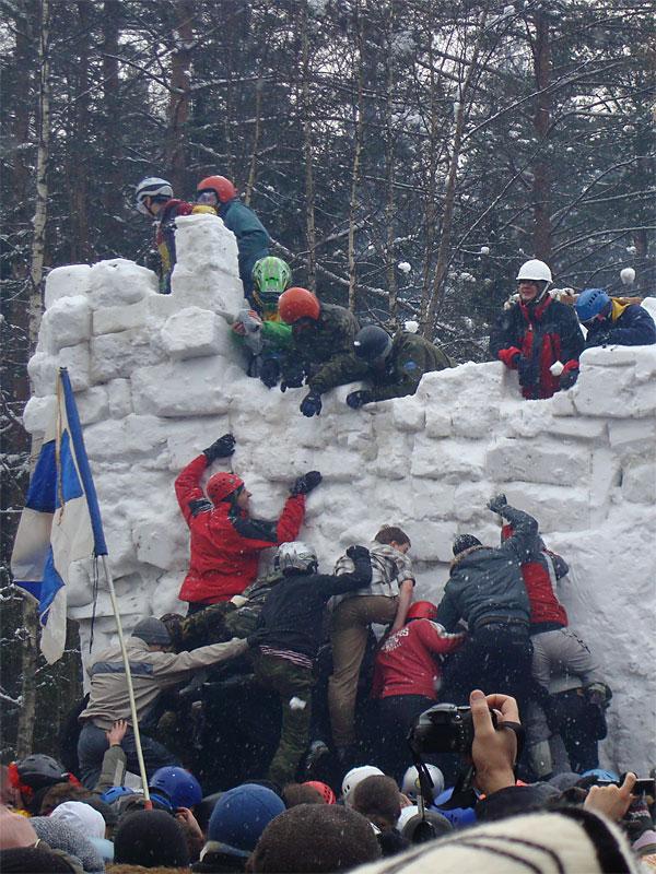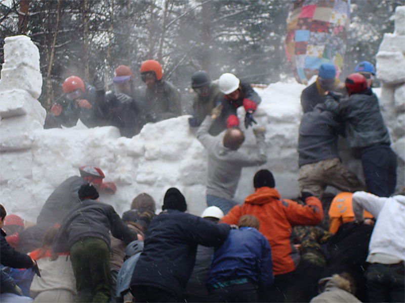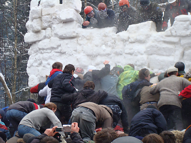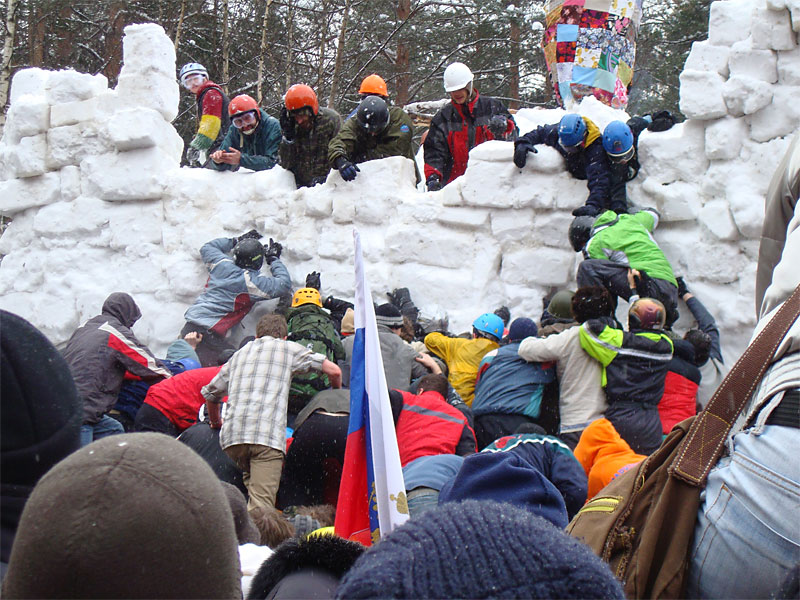 Ни один снеговик при штурме крепости не пострадал, чего не скажешь о людях — некоторым пришлось обращаться в медпункт с отдавленными пальцами, покорябанными ушами и синяками. Победители приветствовали всех сверху.