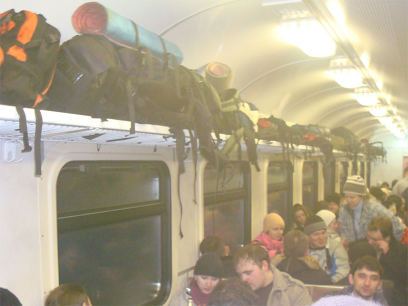 На выходе я встретил пару, которая танцует с нами, и которая тоже не попала в зал (мир очень тесен!). Мне всучили большой, тяжелый и неудобный пакет с мусором, который надо было дотащить почти до станции (а это около 3 км). Дорожка, по которой за 2 дня в обе стороны прошло не меньше 6000 ног, превратилась в ледяной тракт, который и трезвому нелегко давался, а «веселые» ребята падали через каждые 50 метров. Долгая же у них была дорога домой! Когда мы подошли к платформе, уже стемнело. Самые хитрые проехали одну станцию от Москвы и сели на пл. 52 км, большинство же стояло в четыре ряда на платформе, и машинист, наверняка, просто офигел, когда увидел в этом захолустье, у которого даже собственного имени нет, такую прорву людей. Он сбросил скорость гораздо сильнее обычного и едва полз вдоль перрона. Минишок испытал каждый из машинистов, кто сегодня проехал мимо пл. 49 км. Досталось и пассажирам, которые уже занимали половину всех сидячих мест, когда в вагоны ворвались многочисленные непонятно одетые люди с рюкзаками, гитарами и прочими побрякушками. Никогда не видел, чтобы все полки электрички были завалены рюкзаками, даже на слетах (конечно, там нет и десятой части тех, кто был на масленице). Подозреваю, что такой же балаган творился во всех вагонах всех вечерних электричек.