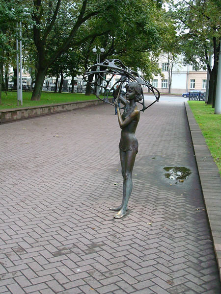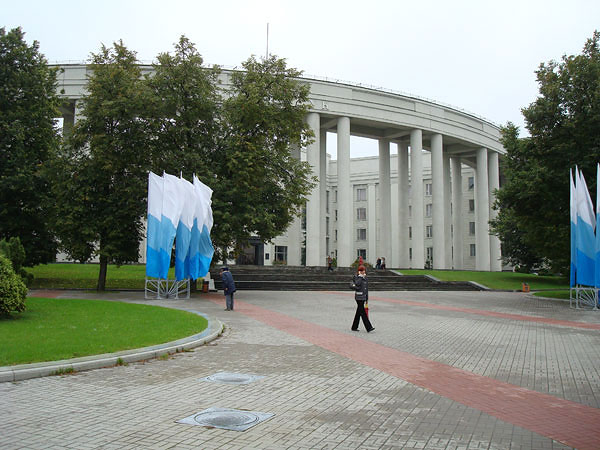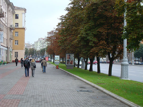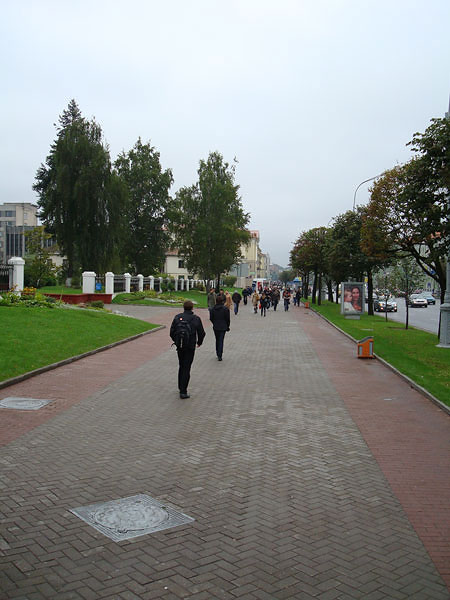 Как и многие другие мои поездки, эта была совершенно спонтанной, и ее не существовало в планах еще за какие-нибудь две недели до ее свершения. Впрочем, первый срок (13—14 сентября) был перенесен на неделю только потому, что 11 сентября билетов на ближайшие выходные уже не было. Непростая кризисная на работе неделя, поздний отъезд из Москвы и ранний приезд в Минск (в 7 по московскому) свалили меня на несколько часов в сон, но к часу дня я был, как огурчик. Погода не баловала солнцем, но было достаточно тепло, не дуло и не капало, чего было достаточно, чтобы безудержно рваться на улицу. Город с первого взгляда произвел впечатление: чистый, опрятный, с широкими улицами, по обочинам которых не стоят в два ряда автомобили, аккуратно расставленными знаками, большими вымощенными плиткой тротуарами, без тусующихся у метро бомжей. Короче, город победившего социализма.