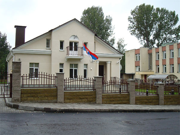 Забавно выглядит «автобусная остановка» на территории посольства Сербии.