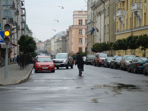В городе не очень много машин. Практически нигде нельзя парковать машину в правом ряду, почти повсеместно стоят знаки, грозящие эвакуатором в случае остановки. Это радикально отличает Минск от Москвы, где стоящие машины занимают зачастую не один, а полтора-два ряда. Очень непривычно и очень приятно видеть свободные дороги. Вдоль многих дорог под деревьями устроены стоянки.