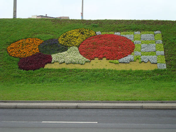 Если б не белый автомобильный номер, не чистота улицы да еще не некоторые детали, то я бы сам поверил в то, что только что сказал :-) На любых наклонных поверхностях могут высадить клумбу. Эта находится в той же промзоне, где и завод.