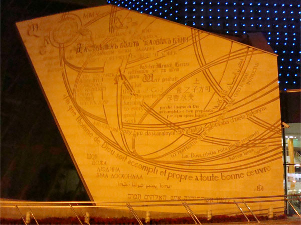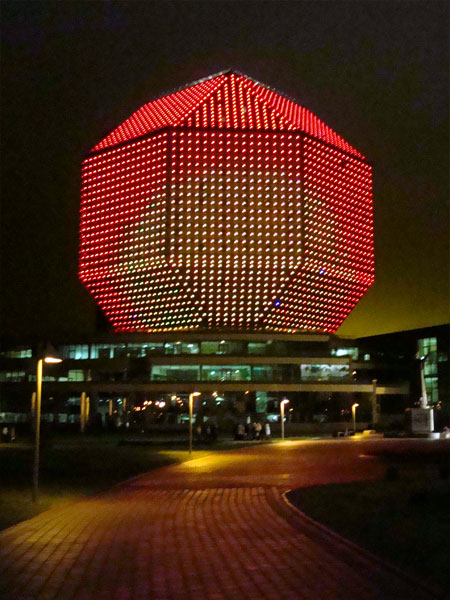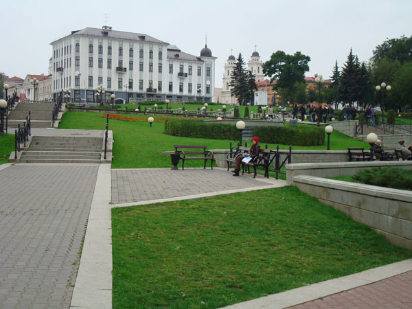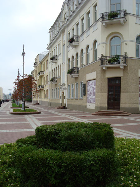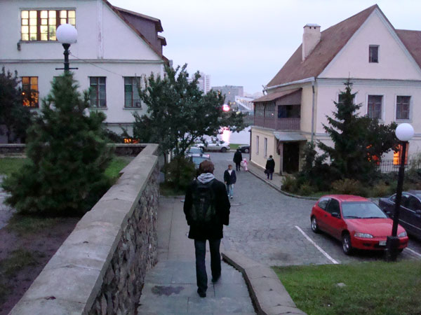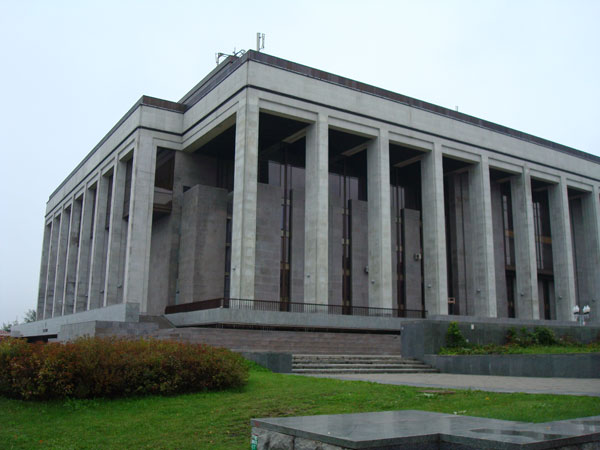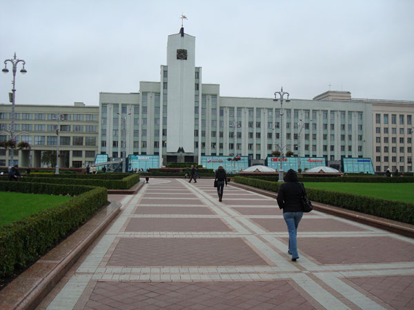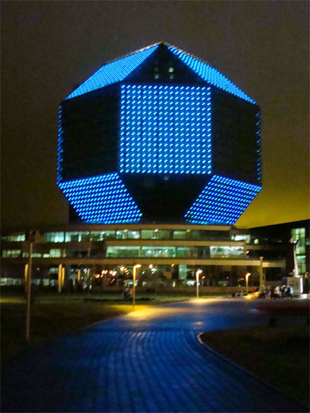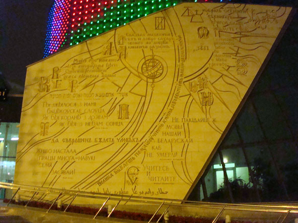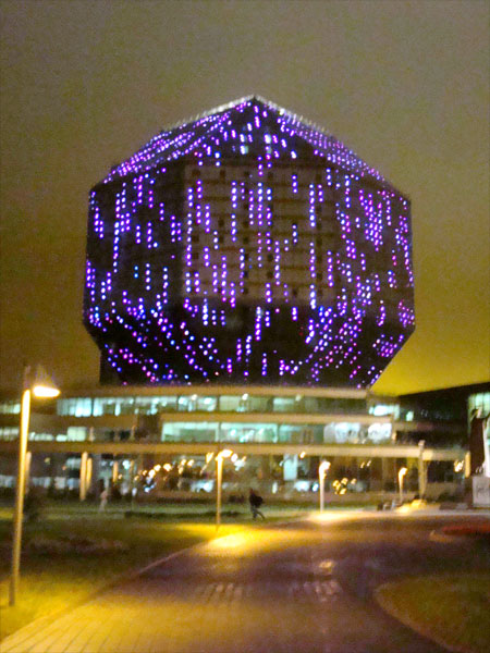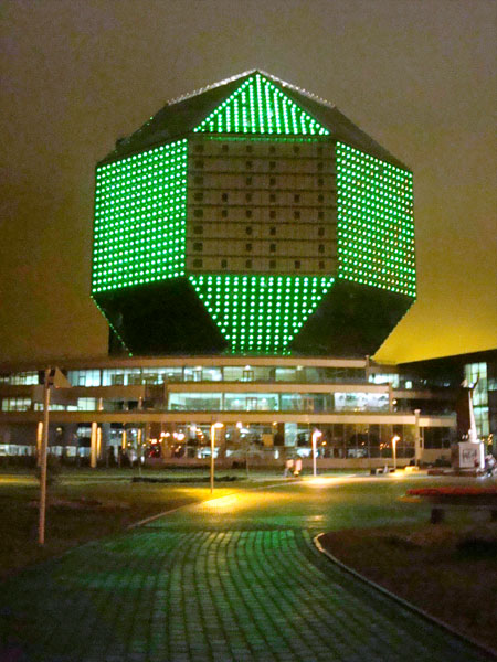 Самое большое впечатление в Минске на меня произвела национальная библиотека — здоровенная хреновина удивительной формы, по которой бегают разноцветные картинки: просто различные цвета, старый досовский скринсейвер «звездное небо», виндовый скринсейвер поновее — абстрактные линии, белорусский флаг, что-то еще. синесине-зеленозелено-краснокрасно-фиолетовофиолетово