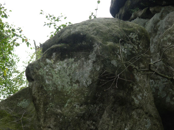 На тропе, помеченной маркерами, стоит куча причудливых камней в форме обезьяней головы, рыбы, ворот. Вот — голова питекантропа.