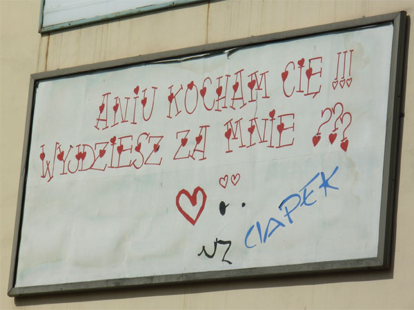 И очень милый плакат. Романтика… «Аня, я люблю тебя!!! Выйдешь за меня??? Чапек». Плакат — это апликация. Небось, еще и сам вручную делал. Ане только позавидовать можно.